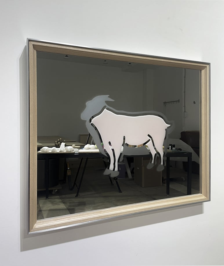 이의성, 털 날리는 계절_Cashmere goat, 2026, spray on mirror, aluminum, wood, 64x52x4cm